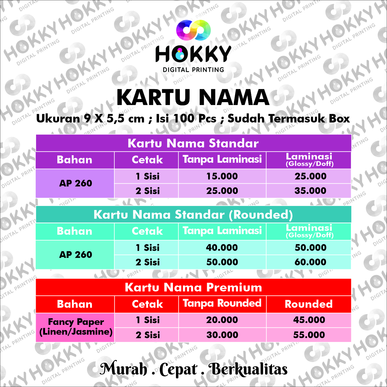 Kami melayani cetak kartu nama murah dan Premium dengan ukuran standar 9×5,5 cm dengan pilihan cetak 1 sisi atau 2 sisi. Bahan yang digunakan adalah Art Paper 260 gram atau Fancy Paper. Anda dapat menambahkan laminasi glossy/doff untuk hasil yang lebih baik. Kartu nama Premium dapat memiliki ujung rounded sesuai kebutuhan Anda untuk memberikan kesan mewah. Paket kartu nama berisi 100 lembar dan sudah termasuk box.